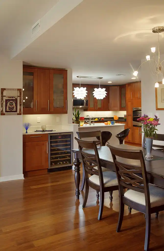 The updated kitchen features clean cabinetry, modern lighting, and a functional peninsula that provides additional workspace and casual seating. Warm wood flooring and contemporary finishes help unify the living and dining spaces while maintaining a comfortable residential feel.