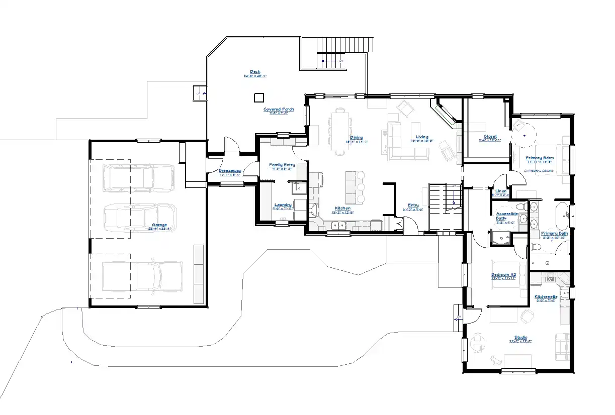 The main level centers around a spacious kitchen, dining, and living area with vaulted ceilings and large windows that bring in natural light and connect seamlessly to the outdoor deck and covered porch. The private primary suite is tucked away for comfort and features a generous layout, walk-in closet, and a well-appointed bath. A secondary bedroom, full bath, and dedicated studio space with a kitchenette provide flexibility for guests, multi-generational living, or creative use.